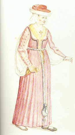 kerchief." (Joyce, Vol. 2, p. 180) The historical costuming list has had a lot of discussion over the years about the construction of the late-period Irish leine. The general consensus is that the sleeve is neither pleated nor has a drawstring along the top -- it's shaped more like the long sleeve of a Japanese kimono, but more rounded at the lower end. The practice of either sewing in pleats or a drawstring comes from an attempt a few decades ago to figure out how to incorporate 6 or more yards of material into the leine. However, given that the material used was probably only about 30 inches wide -- well, that makes a big difference in construction. You could easily use two yards of 30" wide fabric in each sleeve, and another three to four yards in the body of the garment, and not have an overwhelmingly large garment. Moreover, only the very wealthy would have been able to afford lots and lots of extra fabric in their leine. See the last illustration on this page for a good look at the sleeve of a poor man's leine -- it clearly isn't as full as some of the other sleeves on this page, and is shoved up a bit at the elbow. Also, some of the drawings of leinte don't show a large sleeve -- the Durer drawing, for example, and the dancing figures from the whalebone book cover. So it's likely that sleeve length and fullness could have varied from region to region, and most certainly did from one century to another, being narrow in the early middle ages and becoming the large 'bag sleeve' later on, possibly due to the influence of fashion from other areas (puffy sleeves and large, flowing houppelande sleeves from the continent, for example). I don't currently have the time to expand on this page, but hope to do so in the future. In the meantime, please see the following web sites: Reconstructing History -- Kass